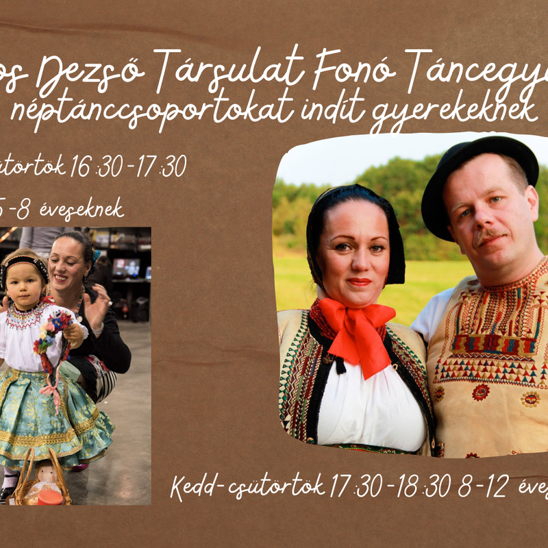 5 éves kortól két korosztályban várja a feltörekvő táncos nemzedék legifjabb generációját! Ha szereted a népzenét, szeretsz játszani, énekelni, ha egy örökmozgó vagy, akkor itt a helyed a néptánc és a népzenéi életnek otthont adó Fonóban. A fonó nem csak a régi idők fontos falusi helyszíne volt, hanem napjaink meghatározó táncos helye is lett Budapesten! Kocsis Enikő és Fitos Dezső Harangozó-díjas táncművészek, koreográfusok, akik számos nemzedéket felneveltek már, lesznek mesterei, szakmai irányítói a tánccsopotoknak! Várjuk szeptembertől az érdeklődőket heti két alkalommal, kedden és csütörtökön 16.30 és 17.30 -tól!